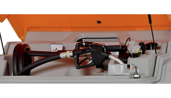 Součástí je elektrické čerpadlo 230 V s průtokem až 72 l/min, mechanický ukazatel hladiny, výklopné oranžové víko a vizuální indikace meziplášťového úniku.