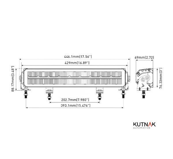 Technicke parametry produktu LED dálkový světlomet s pozičním světlem, 429 x 76,3 x 69 mm od vyrobce Kutnak s kat. kodem 725040.