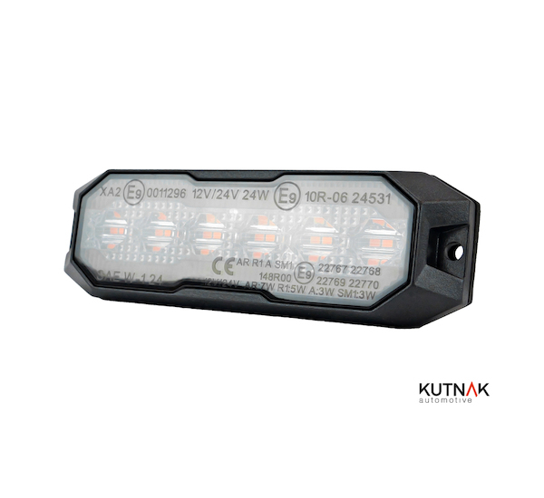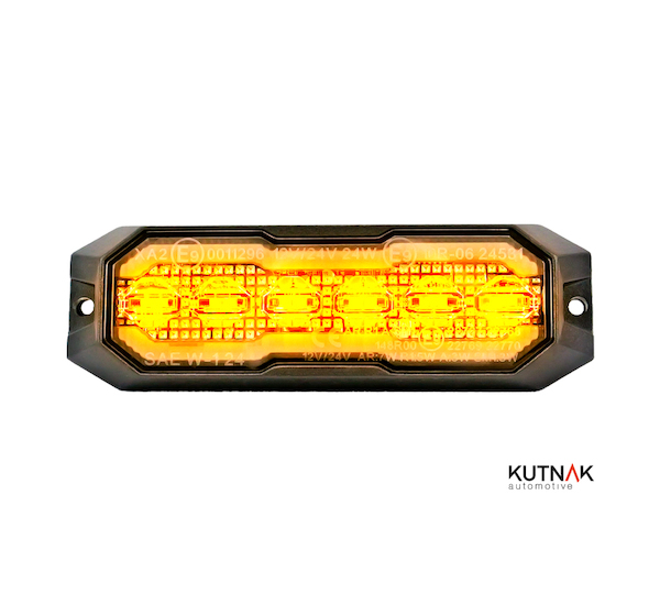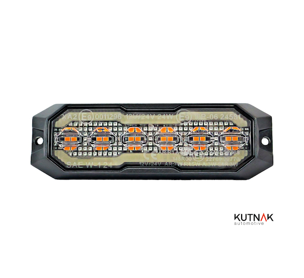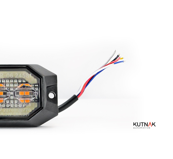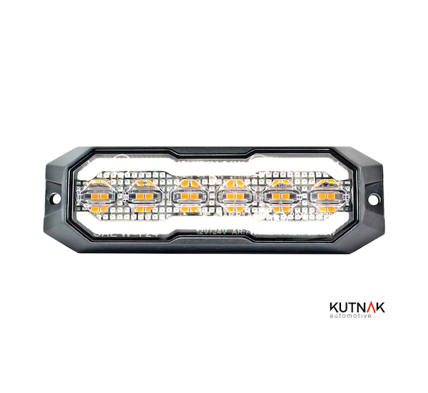 Popis produktu: LED výstražná a poziční lampa. 12 LED výstražné světlo + 42 LED přední poziční světlo. Kouřový kryt, odolný hliníkový panel. DC 12–24V, 6 vodičů, 16 blikajících režimů. Střídavé bílé / synchronizované žluté, s paměťovou funkcí. Certifikace: ECE R65 (XA2), R148, R10, SAE J595 Class 1, CE. IP6K9K – prachotěsné a vodotěsné proti vysokotlaké vodě.Technicke parametry produktu LED VÝSTRAŽNÉ SVĚTLO ŽLUTÉ/BÍLÉ + 0,15 M KABEL od vyrobce Kutnak s kat. kodem 727495.