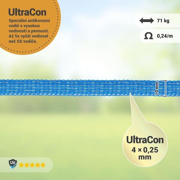 Kvalitní páska pro elektrický ohradník s vodičem UltraCon s vysokou vodivostí a pevností. UV ochrana. Díky velmi silným UltraCon vodičům 4 × 0,25 mm je páska velmi pevná a vydrží. Šířka 10 cm. Zajištění špičkové vodivosti - velmi nízký odpor 0,24 Ω/m.Technicke parametry produktu Páska pro elektrický ohradník, šířka 10 mm, modrá, délka 200 m od vyrobce VNT electronics s.r.o. s kat. kodem FE 8633.