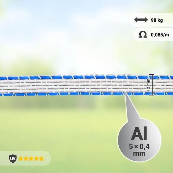 Kvalitní supervodivá PVC páska 12 mm na elektrický ohradník. Obsahuje silné vysoce vodivé hliníkové vodiče 5 × 0,40 mm. Velmi nízký odpor pouze 0,017 Ω/m. Délka návinu 200 m. Výborná viditelnost pásky pro koně. Vysoká ochrana proti UV záření.Technicke parametry produktu Páska PVC pro elektrický ohradník, šířka 12 mm, bílo-modrá, 200 m, 0,017 Ω/m od vyrobce VNT electronics s.r.o. s kat. kodem FE 8496.