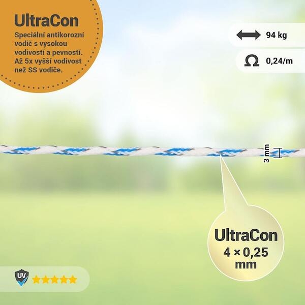 Pletené lanko o průměru 3 mm v atraktivní bílo-modré barvě je ideální volbou pro efektivní a spolehlivý elektrický ohradník. Je perfektní pro ohrady většího rozsahu, a to jak trvalé, tak mobilní. Optimální vodivost, pevnost a bezpečnost pro vaše zvířata, včetně koní, ovcí, skotu či koz. Revoluční vodič UltraCon nízký odpor pouze 0,24 Ω/m.Technicke parametry produktu Pletené lanko pro elektrický ohradník, průměr 3 mm, bílo-modré, délka 200 m od vyrobce VNT electronics s.r.o. s kat. kodem FE 8640.