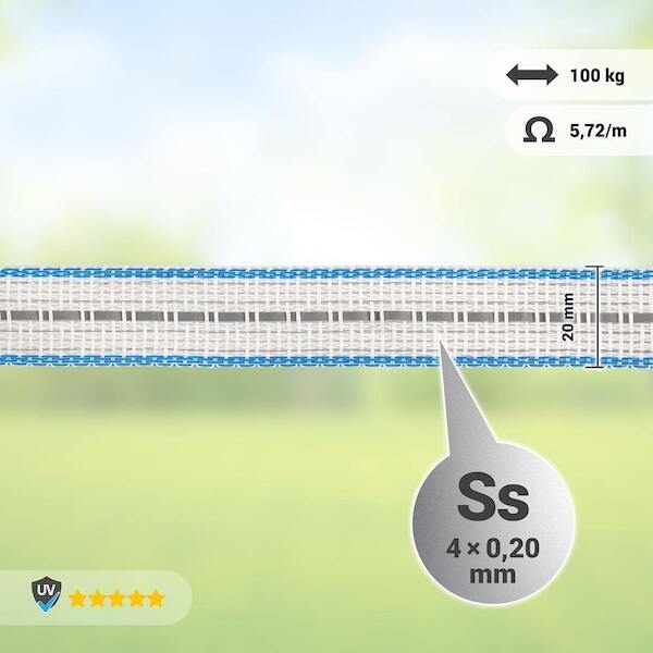 Reflexní páska pro elektrický ohradník s UV ochranou pro vymezení prostoru elektrické ohrady pro koně i jiná zvířata. Pevný nerezový vodič 4 × 0,20 mm. Pro kratší a středně dlouhé ohrady. Modré lemování. Odpor 5,7 Ω/m. Použití kolem silnic a komunikací.Technicke parametry produktu Reflexní páska pro elektrický ohradník, šířka 20 mm, bílo-modrá, délka 200 m od vyrobce VNT electronics s.r.o. s kat. kodem FE 8641.