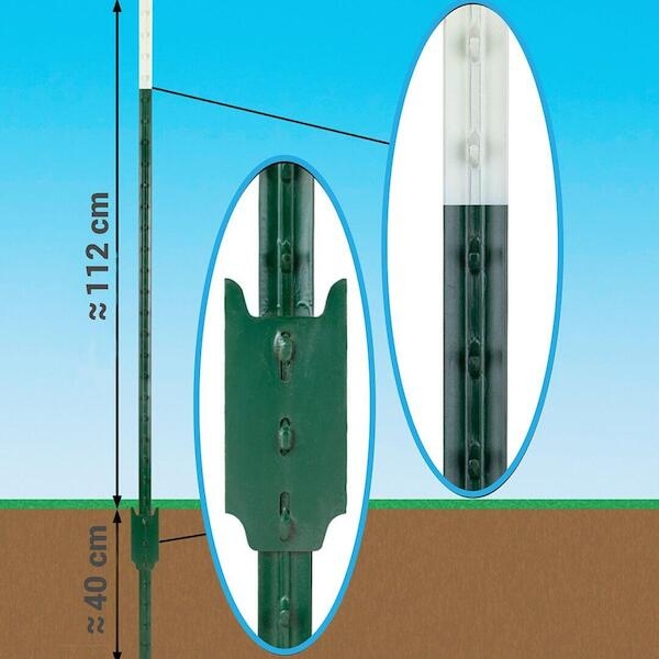 Zvýhodněná sada robustních T-sloupků včetně krytek. Pro dlouhodobé použití u elektrických ohrad. Povrchové ošetření pro dlouhodobou ochranu proti povětrnostním vlivům. Výška nad zemí 112 cm, ukotvení cca 40 cm - velmi dobrá stabilita.