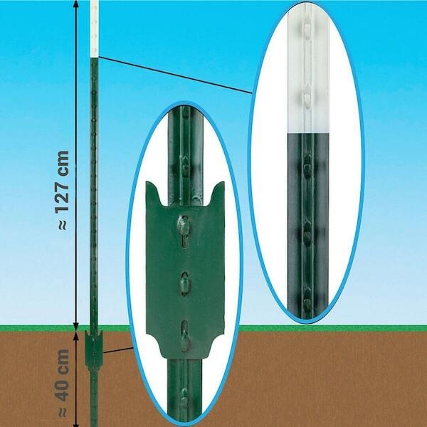 Zvýhodněná sada pevných T-sloupků včetně krytek. Pro dlouhodobé použití u pevných elektrických ohrad. Povrchové ošetření pro dlouhodobou ochranu proti povětrnostním vlivům. Výška nad zemí 127 cm, ukotvení cca 40 cm - velmi dobrá stabilita.
